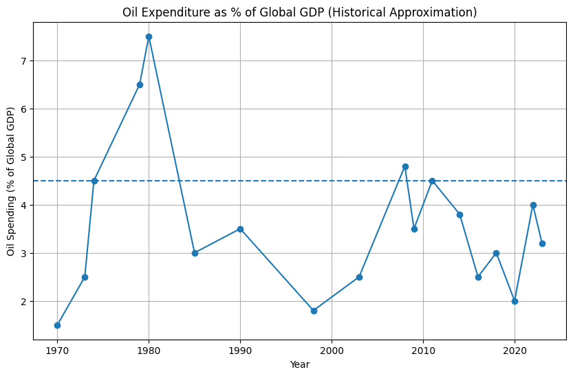 Historically, a clear threshold has emerged. When global oil spending approaches 4 to 5 percent of GDP, recession risk rises sharply.