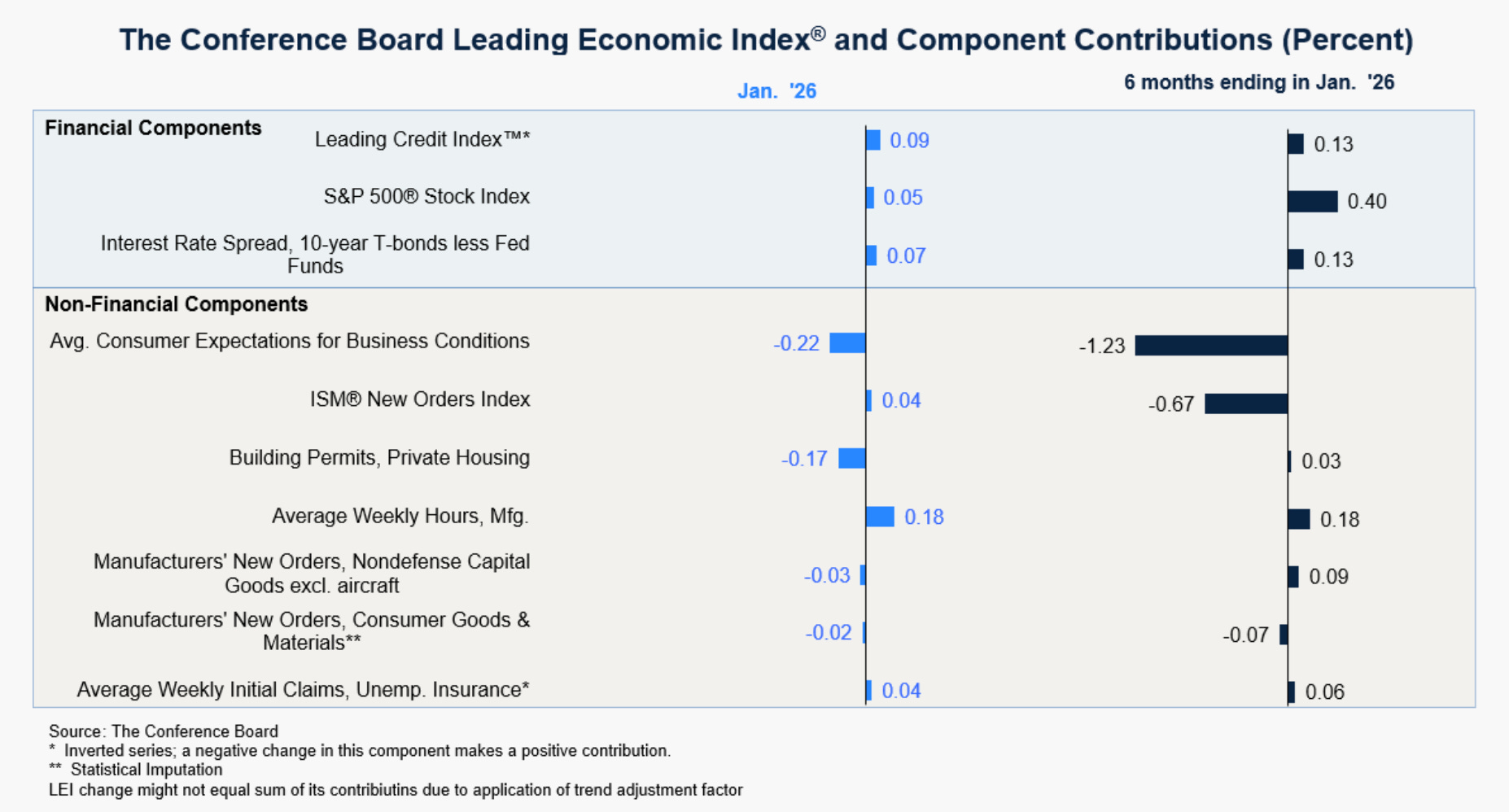 Among those forward looking signals is the Leading Economic Index (LEI), published by The Conference Board. The LEI is a composite of ten forward-looking components that, taken together, provide a reliable sketch of the economic future.