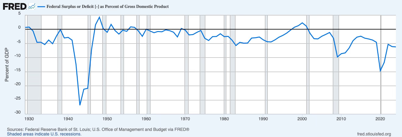 U.S. federal deficits currently hover around 5.8–6.4% of GDP—large, yes, but far from catastrophic when measured against the enormous U.S. economic engine.