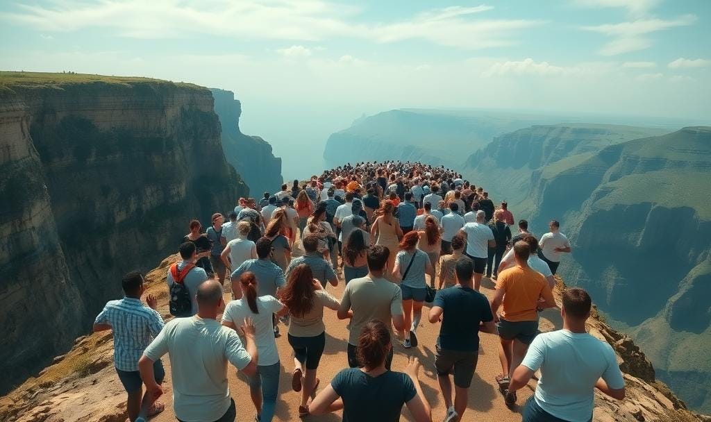 The crowd stampedes because it feels safer to run together… even if the cliff edge is right ahead.